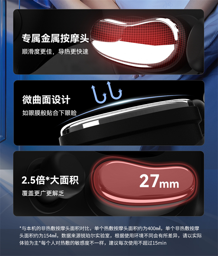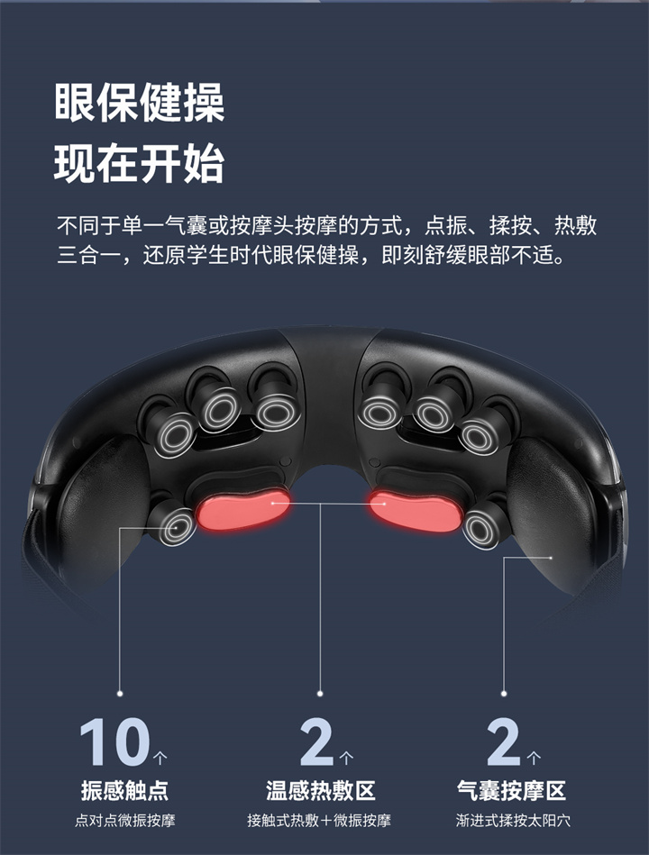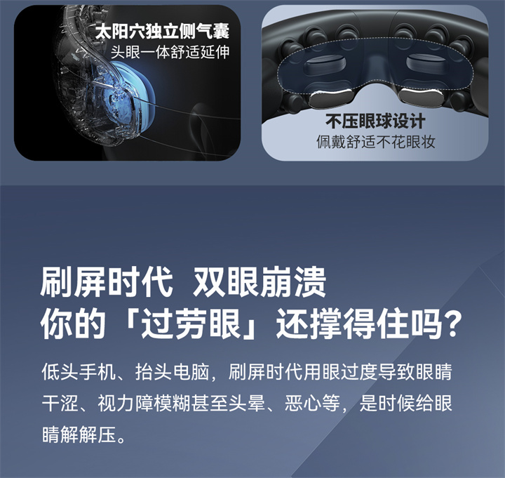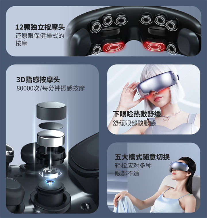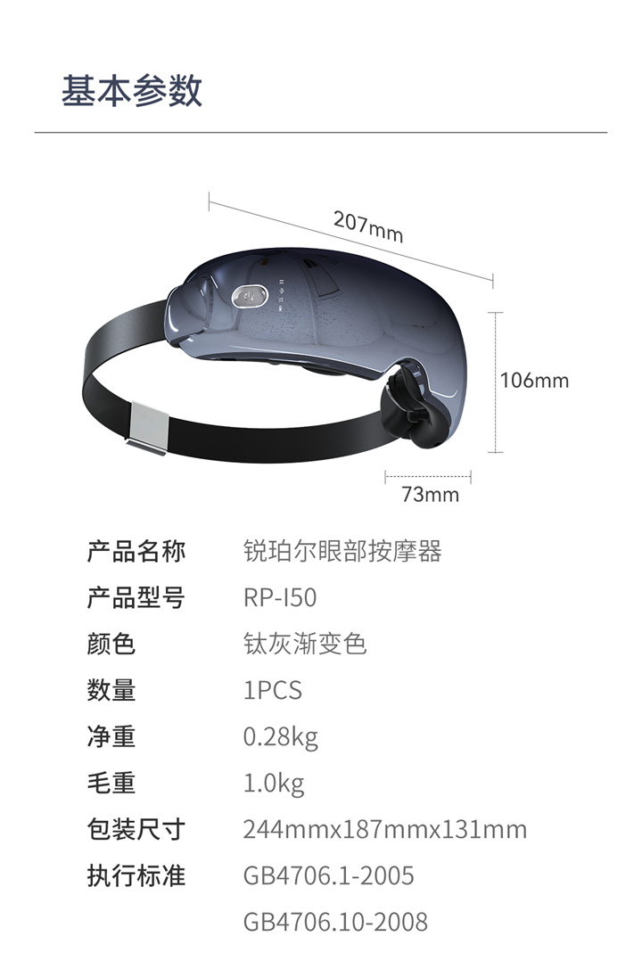 銳珀?duì)?/a>眼部按摩器RP-I50,根據(jù)國人眼型設(shè)計(jì),機(jī)身弧度更貼合眼眶,貼心預(yù)留立體凹槽,保護(hù)眼球,按摩后視力不模糊,自帶應(yīng)急可視窗,可舒緩全黑密閉焦慮感;內(nèi)置大自然的場(chǎng)景音效,讓眼睛和心靈雙重放松,還有藍(lán)牙連接,可以隨心聽歌、聽書等,更多神奇功能,等待您親自試戴發(fā)現(xiàn)……