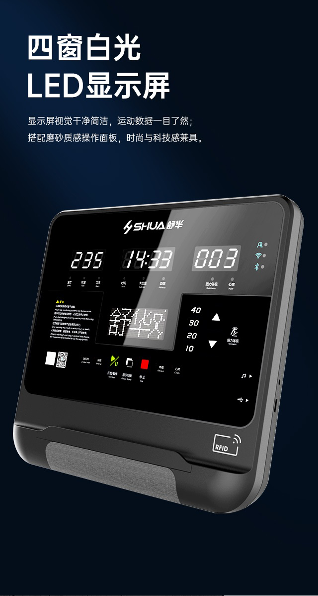 舒華高端跑步機SH-T9100T(V10+)擁有超大高清32寸10點觸控晶屏的工業(yè)屏,具有掃碼、刷卡、人臉識別等多種智能登錄方式,方便快捷,并且有在線教學、專業(yè)健身模式隨意切換,讓您開啟科學健身。