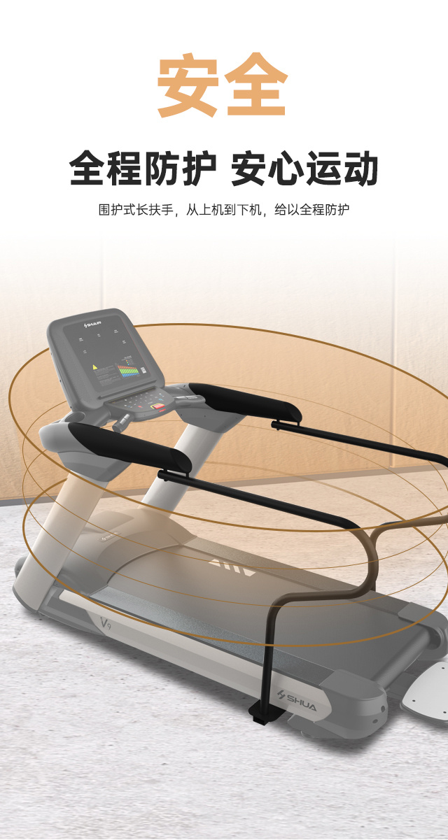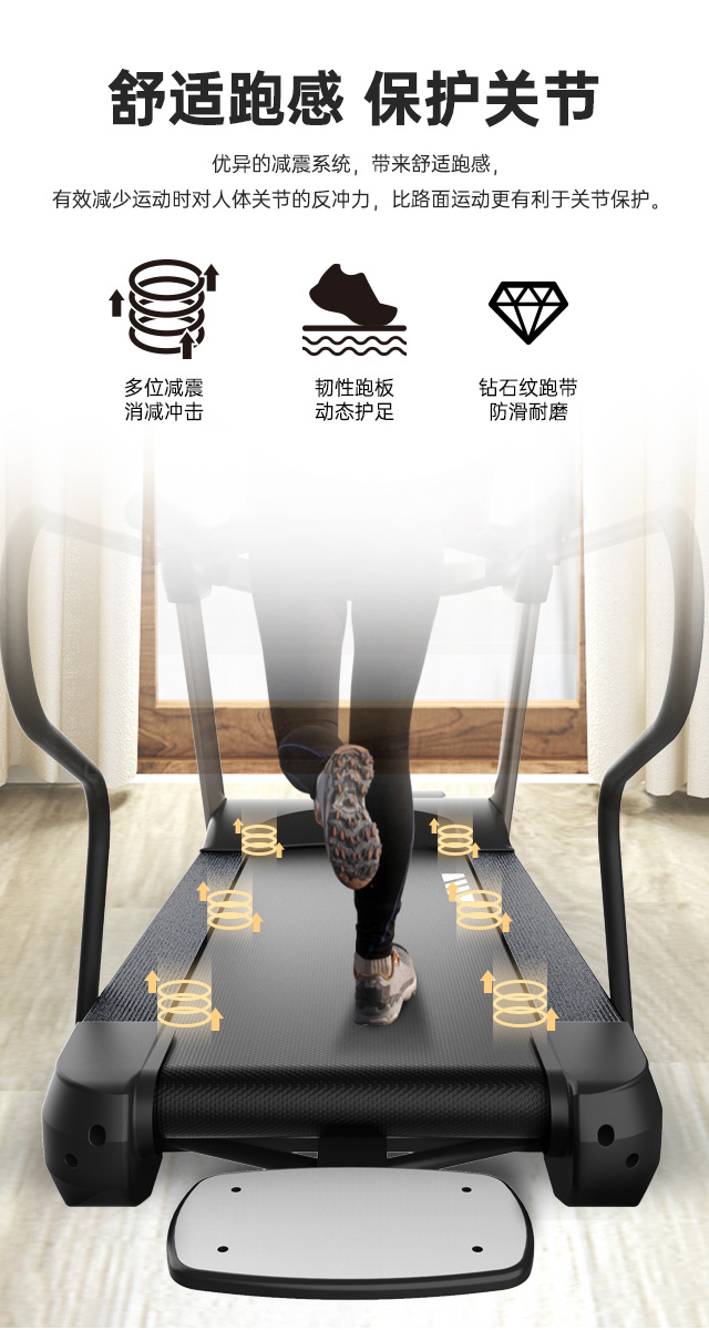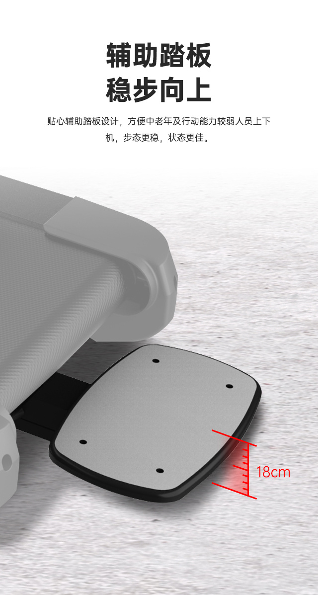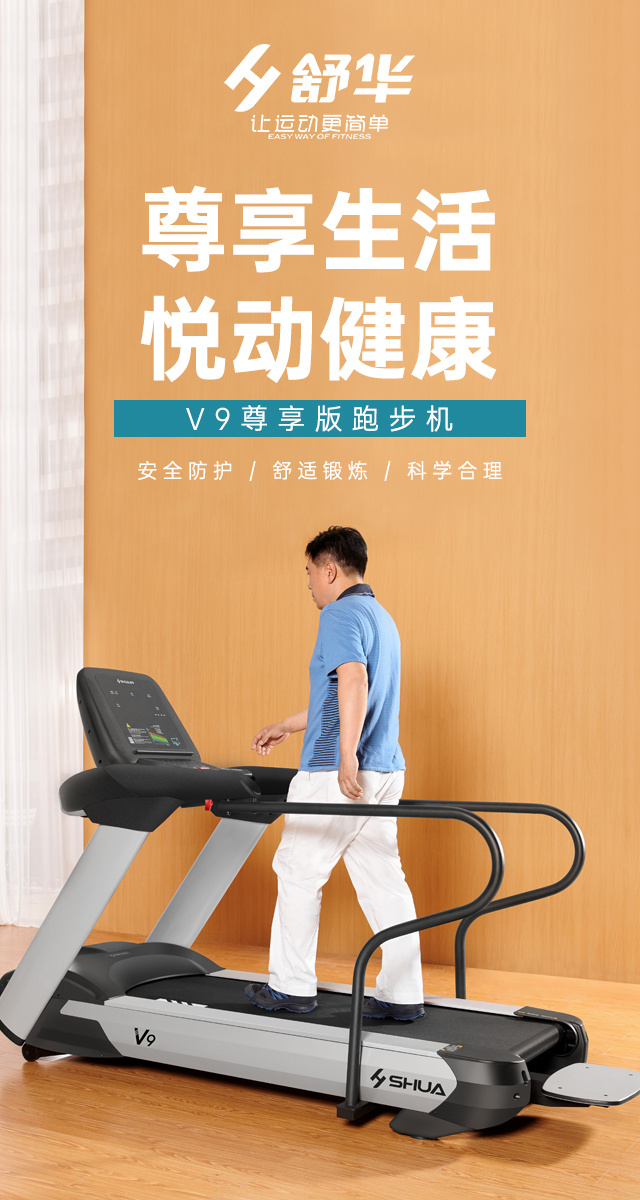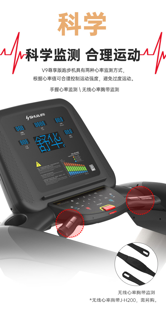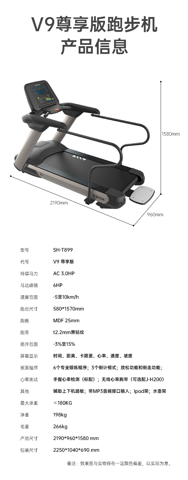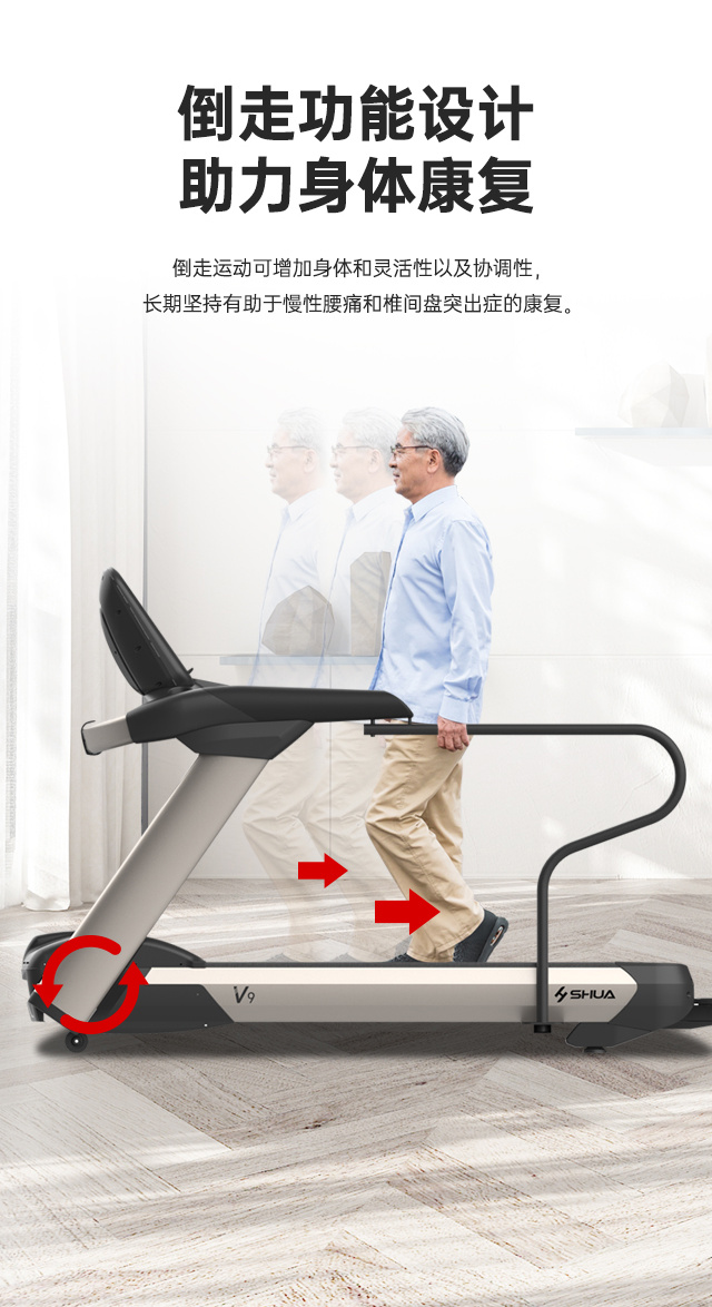 舒華V9尊享版跑步機SH-T899設(shè)有輔助上下機踏板的驅(qū)動踏板,控制速度在-5至10km/h內(nèi)可調(diào),坡度也可在-3至15%內(nèi)可調(diào),跑臺尺寸是580×1570mm,持續(xù)馬力是AC 3.0HP。