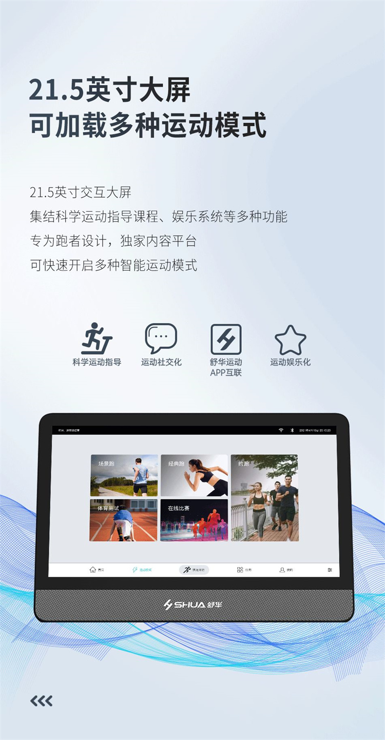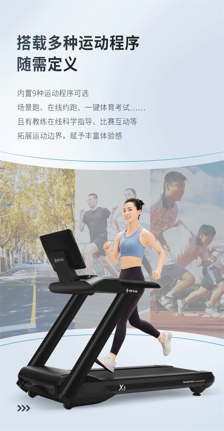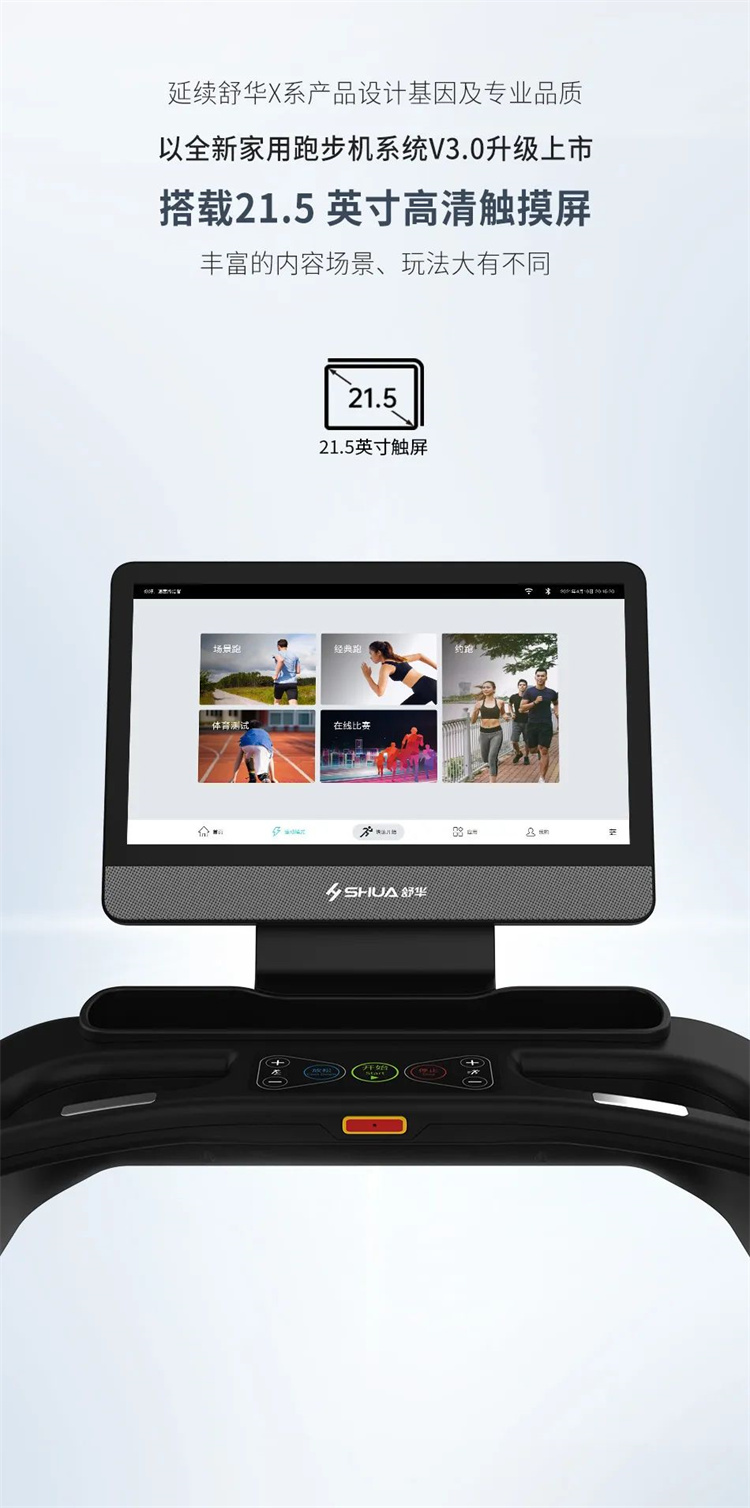 舒華X5 Pro豪華智能跑步機(jī)采用全新舒華跑步機(jī)系統(tǒng),搭載21.5寸大屏,內(nèi)置九種運(yùn)動(dòng)程序,包括場景跑、在線約跑和一鍵體育考試等內(nèi)容,亦有教練在線科學(xué)指導(dǎo)和比賽互動(dòng),可在線升級,歷經(jīng)耐久性測試,讓您使用更安全,雙跑臺設(shè)計(jì),全減震系統(tǒng),核心動(dòng)力采用F級耐高溫馬達(dá),5.0HP峰值馬力,提供源源動(dòng)力,讓您享受每一次暢跑體驗(yàn)。